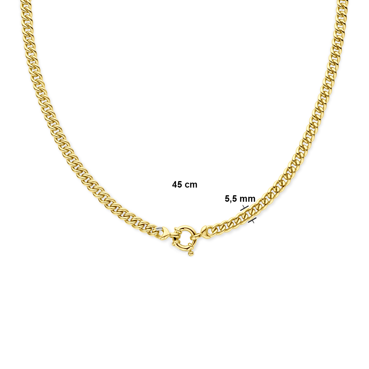 Sieraden van 14 karaat goud met daarin een kern van 925 zilver. Geelgouden collier met gourmette schakel. De schakelbreedte is 5.5mm.