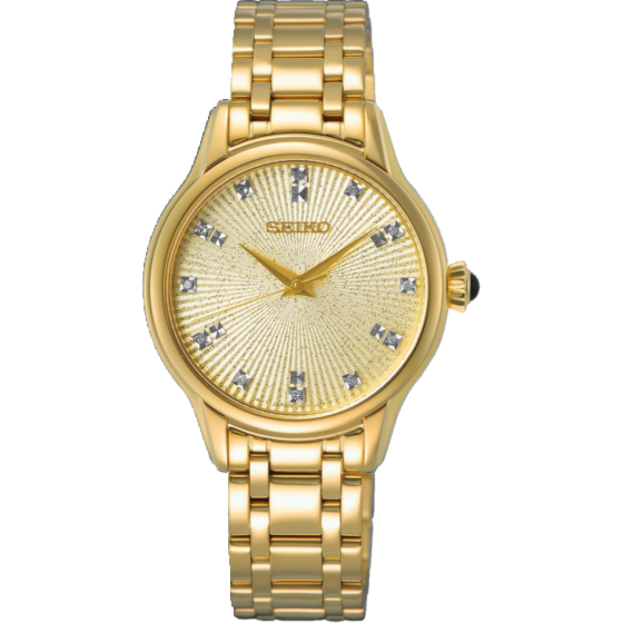 Dit is een dameshorloge van het merk Seiko. Het is een analoog horloge gemaakt van staal. De diameter van de kast is 29.5 mm en de kast is 6.3 mm dik.