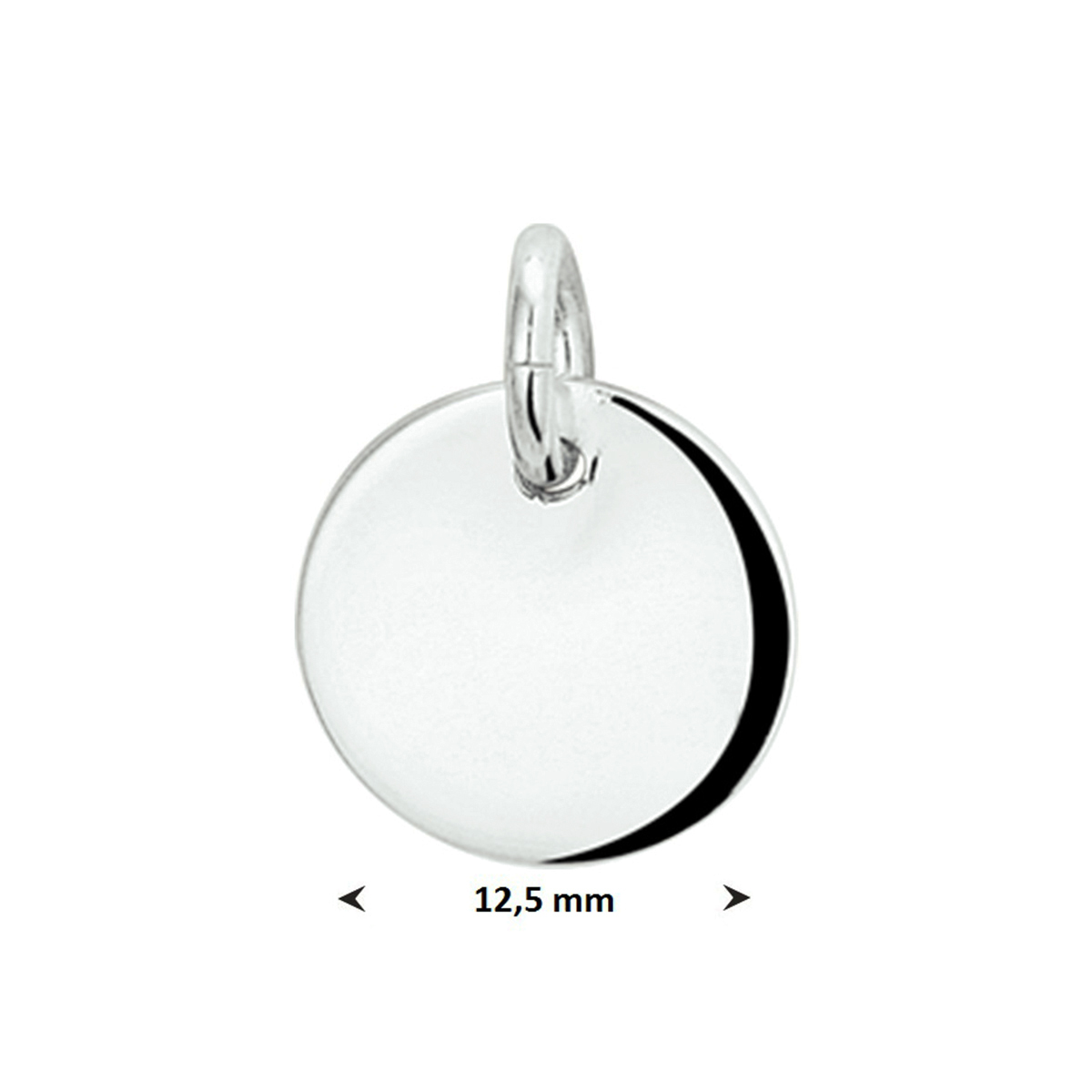 Gerhodineerd zilveren ronde graveerhanger met een diameter van 12.5mm uitgevoerd met een stevig hangoog. De hanger heeft een dikte van 0.9mm.